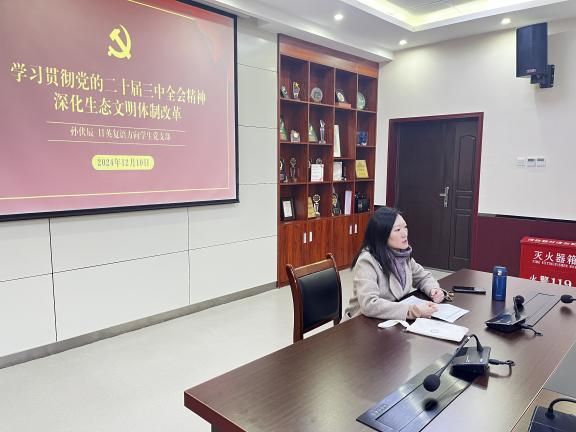 孙伏辰围绕党的二十届三中全会精神,以深化生态文明体制改革为主题,结合身边实例进行了深入细致的讲解。她首先对新时代生态文明体制改革取得的显著成效进行了阐述,包括生态文明制度、责任、管理体系、重大意义等方面。同时,孙伏辰强调了深化生态文明体制改革在新征程中的重大意义,明确指出深化生态文明体制改革是推进美丽中国建设、实现人与自然和谐共生现代化的根本动力,是高水平保护支撑高质量发展的必然要求,是以生态环境根本好转增进人民福祉的重要保障。她指出,支部党员同学在日常学习生活中需积极发挥模范带头作用,自觉践行绿色环保理念,同时发挥辐射作用,带动周围同学践行习近平总书记关于生态文明建设的相关要求。