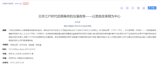 许文英老师在国内著名历史类期刊《世界历史》上发表了题为“日本江户时代后期大名权力演进及其影响——以德岛藩为中心的考察”的学术研究论文。该期刊为CSSCI 中文社会科学引文索引(2021-2022)来源期刊,是国内世界历史研究方面的权威期刊。该文以日本江户时代(1603—1867)的德岛藩(今德岛县)为例,大量使用同时代遗留的历史文献,具体论证了江户时代后期大名权力的演进过程、特征和历史意义。此外,许文英老师还在《日语学习与研究》上发表了“日本江户时代后期幕府的治藩政策”一文。
