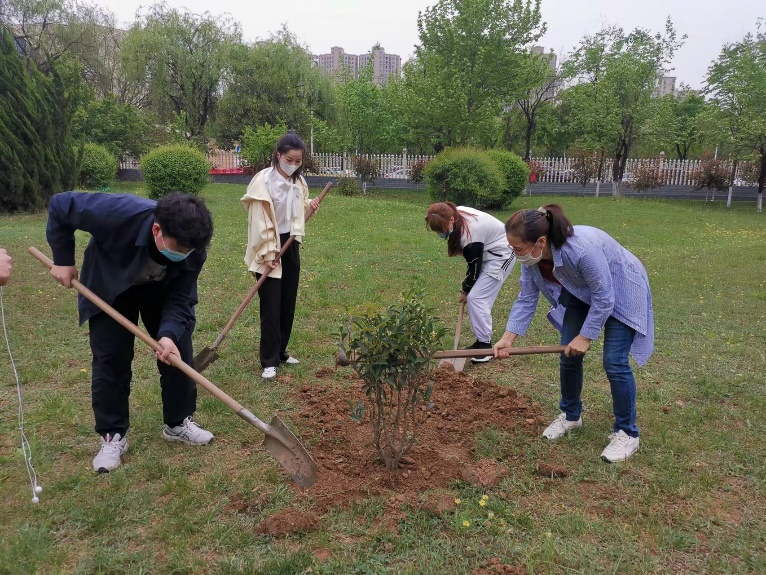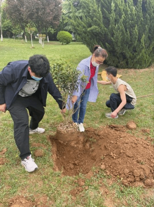 同学们在老师的帮助指导下,撸起袖子、拿起锄头、铁锹,刨土挖坑,个个干劲十足,脸上挂着灿烂的笑容,同时也把同学之间的珍贵友谊和对学校老师的培育之恩寄托在了亲手种下的纪念树上。