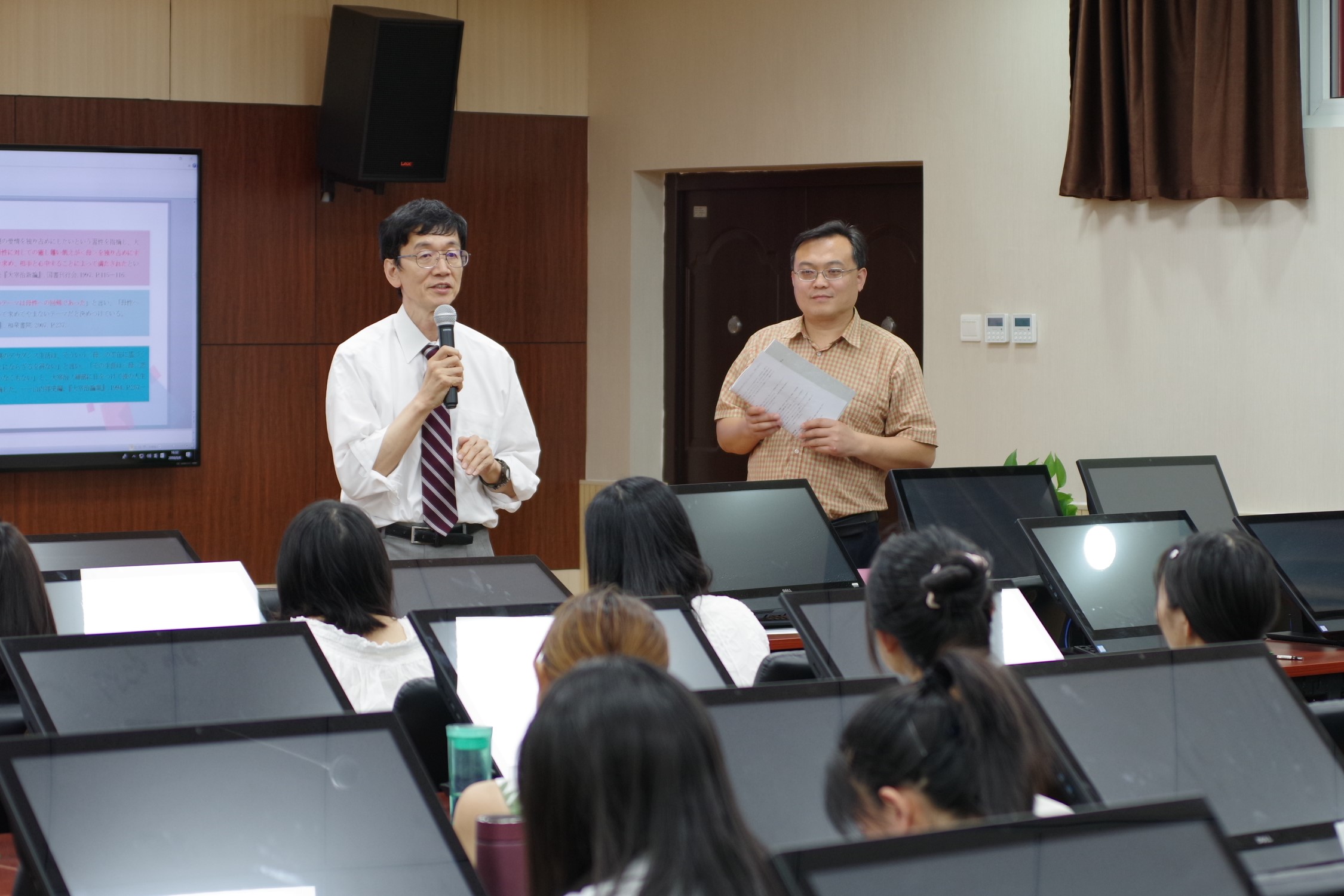首先,木下徹教授做了题为“脳科学の言語教育と習得への応用の可能性:脳イメージングを中心に”的基调演讲。此次演讲为在场的老师和同学介绍了脑科学在语言习得和外语教育等领域的应用中的可能性,并就此问题进行了深入的讲解。接下来,杉村泰教授做了题为“日本語の自他受身と指示詞の選択”的基调演讲。此次演讲向大家介绍了日语的自他动词以及被动的选择,并介绍了困扰学习者已久的指示词,从新的角度对其进行了研究,给在座的各位老师及同学带来的新的启发。在最后的互动环节,老师及同学们踊跃发言,积极提问,现场气氛十分活跃。木下徹教授和杉村泰教授对大家提出的问题做了耐心的解答,激起了大家对新研究领域的浓厚兴趣,拓展了大家的学术视野。