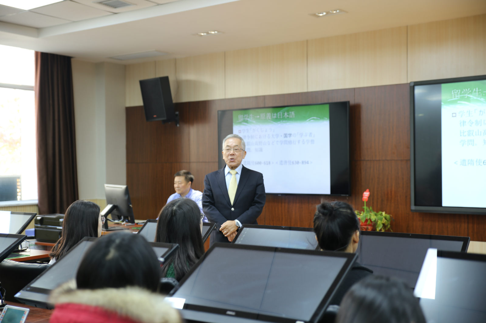 讲座正始后,关根谦教授分别跟大家分享了自己来中国的经历、自己的家庭、自己与西安的历史渊源等。接着,关根谦教授就留学的历史,留学的意义等热点问题向同学们进行了分析。随后,关根谦教授以清朝时中国驻日本参赞黄遵宪为例展开话题,对早期的中国留学生进行了介绍。在为同学们介绍了一个个事例后,关根谦教授感叹道,正是留学才让近代的中国学生首次萌发了国家意识。