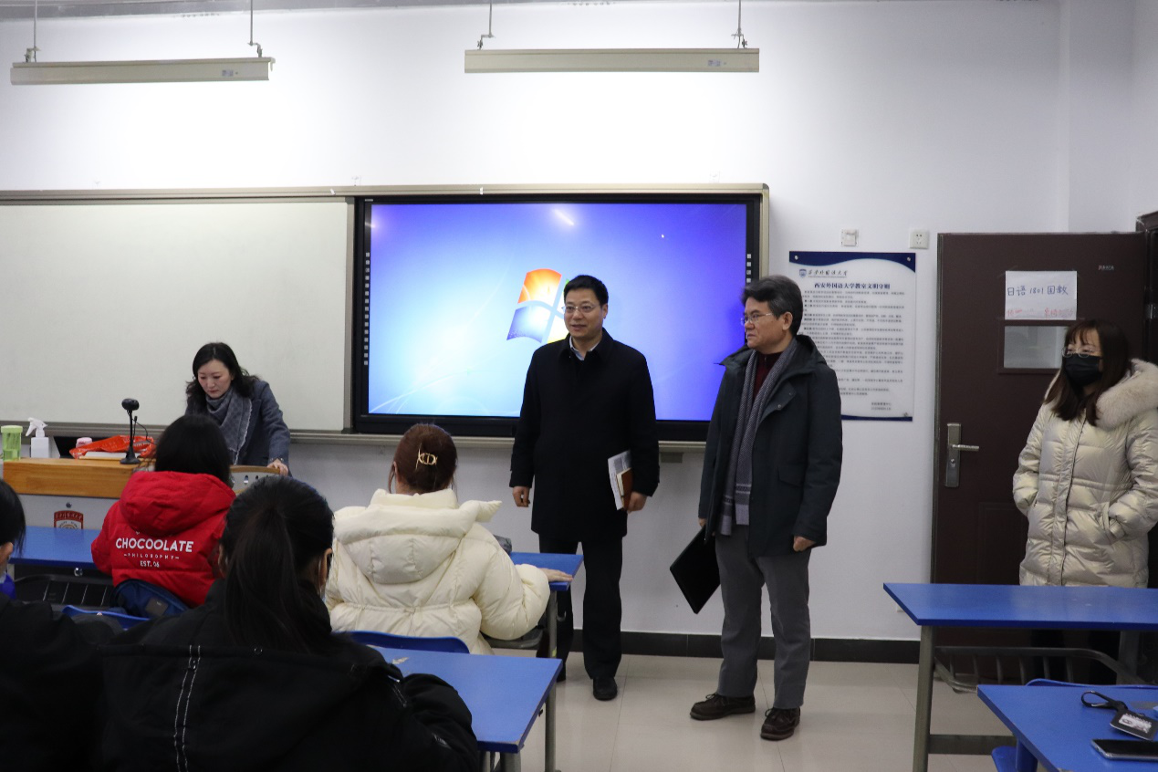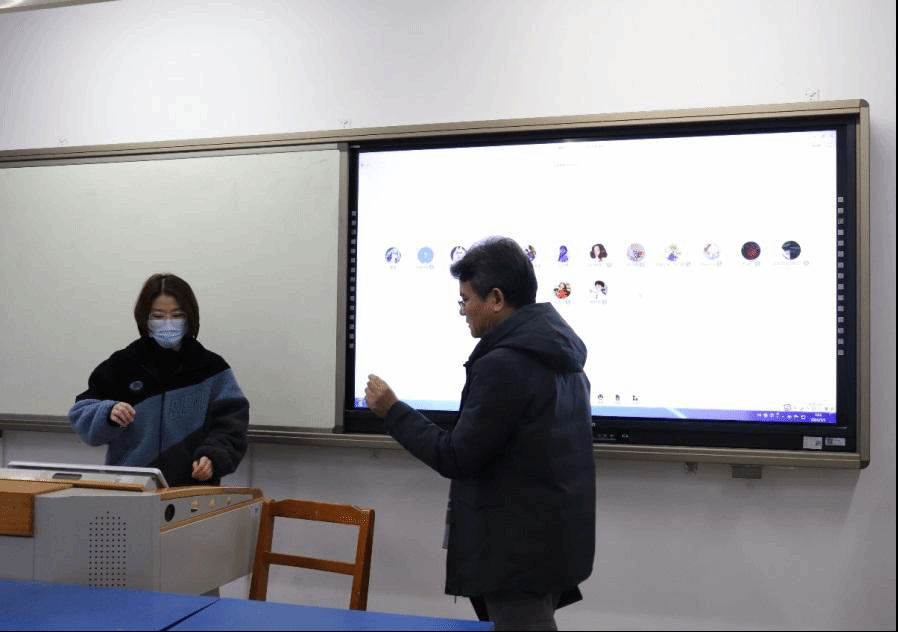 检查组查看了开云体育 19个班级的线上线下同步教学情况,与任课教师和同学们就课堂教学的前期准备、教学设备和教学环境等进行了交流,与网络远程授课的国外教师进行了对话,全面了解教师教学和学生听课的现实情况。