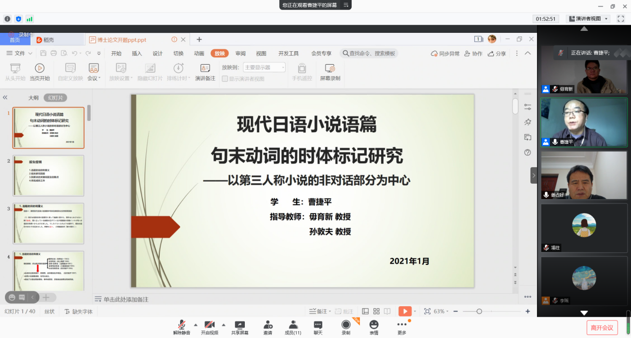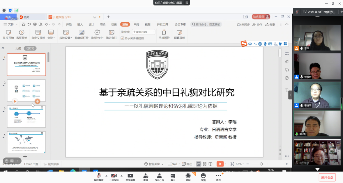 本次开题答辩是我校日语语言文学专业开始博士生培养以来的首次答辩。这场历时三个半小时的线上答辩过程严谨规范,秩序井然。答辩委员们认真负责,评价客观实际,既有对同学们的鼓励与鞭策,也有对存在问题的犀利批评和指正,取得了良好的效果,对我校日语语言文学专业博士生培养意义非凡。
