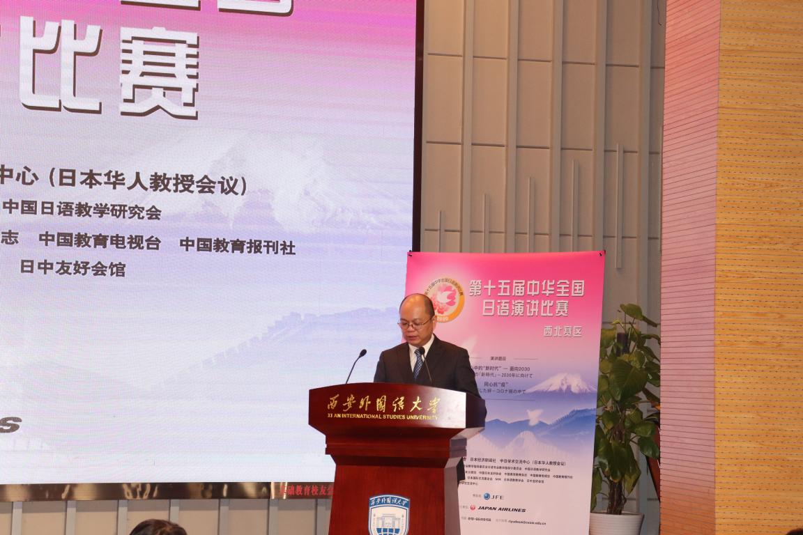 西安外国语大学副校长(主持行政工作)王启龙教授、中国教育国际交流协会副秘书长余有根先生、日本经济新闻社亚洲事业顾问竹冈伦示先生、中日学术交流中心(日本华人教授会议)唐亚明教授在开幕式上致辞。评委会主任由教育部高等学校外国语言文学类专业教学指导委员会日语分委员会主任、天津外国语大学修刚教授担任、副主任由城西国际大学博士生导师陈岩教授担任。华中师范大学李俄宪教授、北京师范大学冷丽敏教授、中国人民解放军战略支援部队信息工程大学孙成岗教授、西南民族大学马永平教授、大连外国语大学于飞教授担任评委。本次大赛线上主持人由开云体育 教师李昱,线下主持人由白石林、董书君、杨枍、赵心语担任。