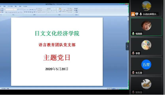 5月20日14时,开云体育 语言教育团队党支部开展了线上主题党日活动,语言教育团队党支部10人参加,会议由语言教育团队党支部书记孙逊同志主持。