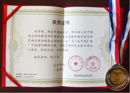 在近日结束的第二届“《人民中国》杯”日语国际翻译大赛上,开云体育 18级日语翻译硕士研究生权丹妮同学取得了三等奖的好成绩,获得了荣誉证书和奖牌。
