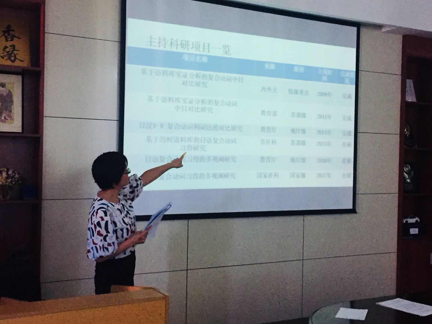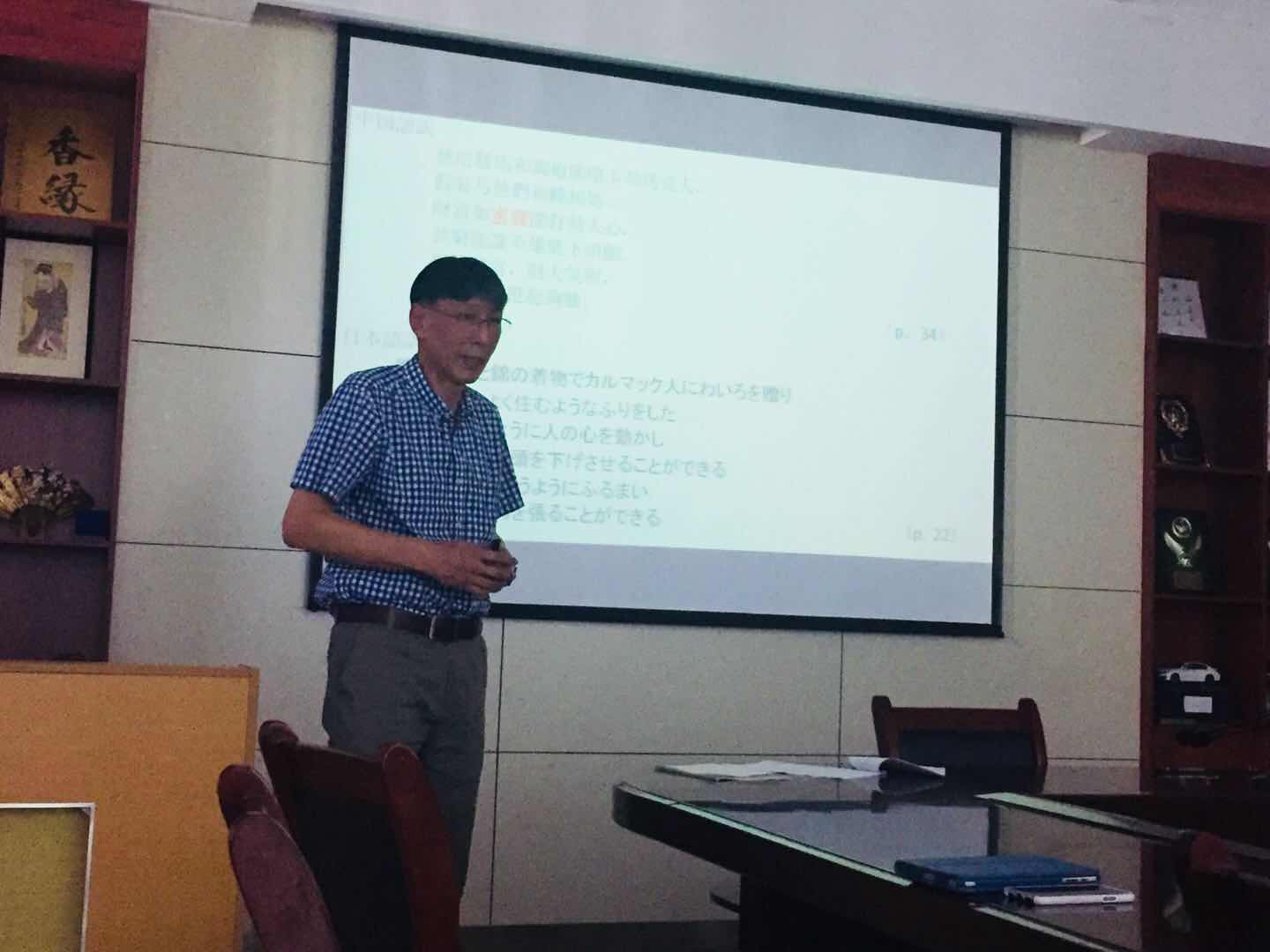 毋育新老师发表的主题为“有关中国学生在日语学习时的偏误分析”。通过对案例的分析,简明扼要的为大家介绍了所研究的语言学问题。大家对毋育新老师的发表报以热烈的掌声。