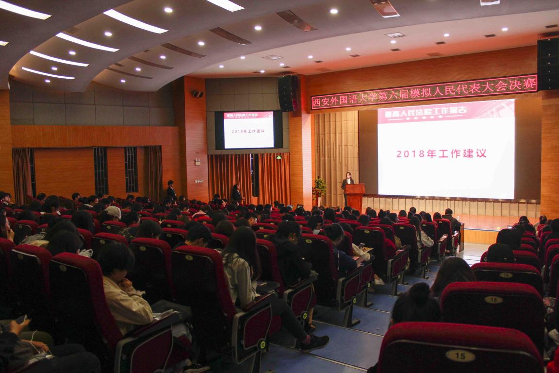 庄严的奏唱国歌仪式后,大赛正式开始。模拟国务院总理、模拟全国人大常委会委员长、模拟最高人民法院院长、模拟最高人民检察院检察长4位模拟领导人依次做政府工作报告。随后进入议案展示环节,分别由进入决赛的8支代表团队模拟八个省(市)提出议案并对各省(市)记者团提出的问题进行详细回答。各代表团主题鲜明论点新颖,聚焦当下转型时期所涌现出的经济发展、环保、改革、大学教育、安全等社会热点。案例真实论证具化,数据直观资料详实,调研剖析深入浅出,论证阐述有理有据。各代表团以当代大学生的独特视角层层解读,分别从大政方针、环境资源、教育投资等诸多方面建言献策,展示了西外学子良好的观察、思辨和语言表达能力。在点评环节,学生处处长郑锐华总结点评,他首先对所有代表团的精彩议案给予了高度评价,并建议将所有议案归纳整理后提交相关省(市)人民代表大会,同时鼓励更多的西外学子参与到时政中来,在民生问题的解决上积极建言献策,真正实现青年大学生参政议政、关心国家时事。