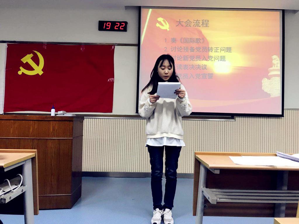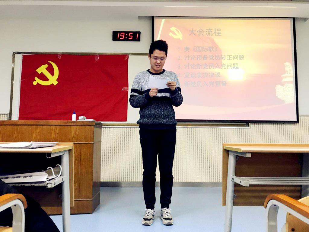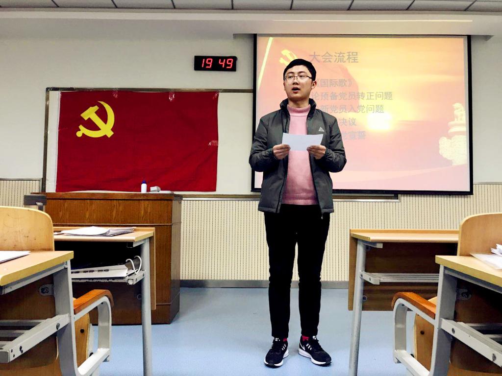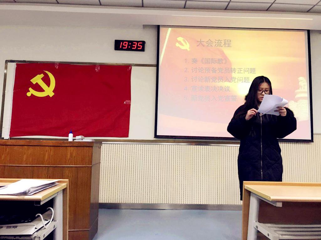 伴随着激昂的国际歌,本次大会正式开始。会议主要有两项议程,一是审议表决付隽、唐萍等19位预备党员的转正申请;二是审议表决张璐、李汶哲等32位发展对象的入党申请。学生支部严格按照相关程序,要求32位发展对象和19位申请转正的预备党员对自己一年以来的思想、学习、工作、生活等方面进行了全面的汇报和总结。他们的入党介绍人和培养联系人分别向大会汇报了培养、考察对象的情况。