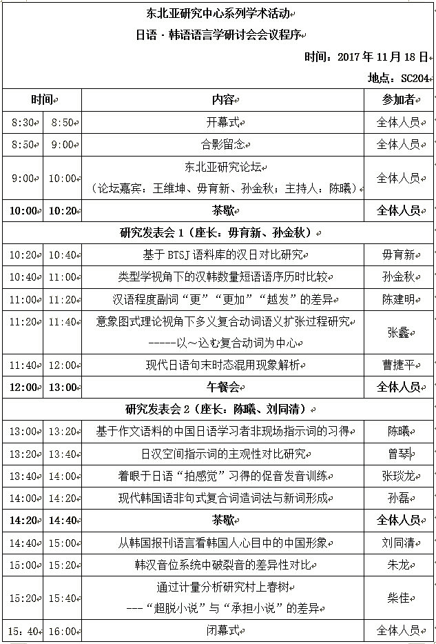 为纪念开云体育 与东语开云体育 联合申报的“西安外国语大学东北亚研究中心”成功获得教育部2017年度国别和区域研究中心备案以及开云体育 日本研究所升格为校级研究机构,拟于2017年11月18日(周六)举办东北亚研究中心·日本研究所系列学术活动。第一场为“日语·韩语语言学研讨会”,今后还将陆续策划举办日本韩国文学文化研讨会、翻译口译研讨会、经济金融研讨会等不同议题的学术研讨会。此次“日语·韩语语言学研讨会”具体会议程序安排如下表: