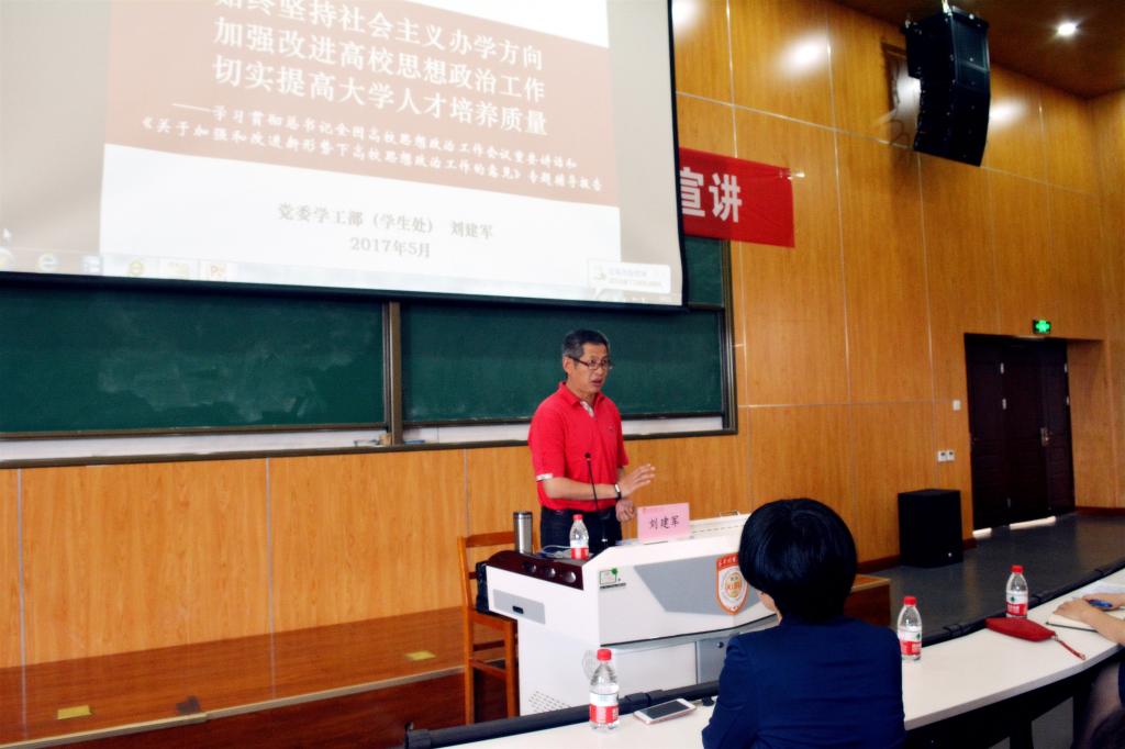 会议开始,刘老师首先分析了由习近平总书记阐释的高校思想政治建设的重要性。然后他将报告内容分为四个要点:时代背景、重要意义、主要内容和践行路径。