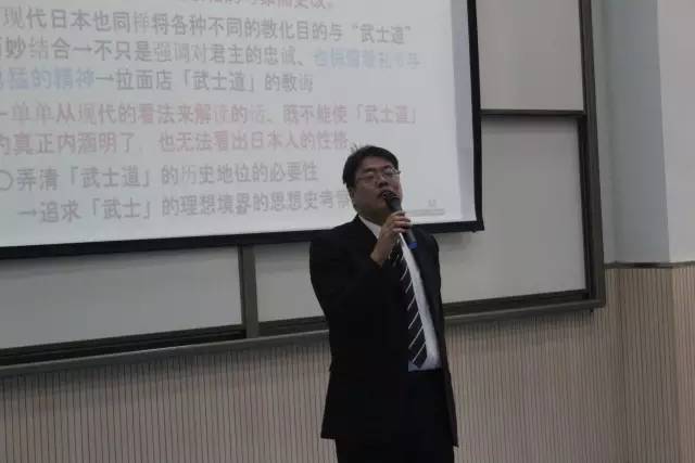 在讲座开始之初,中嶋博士用幽默的语气和风趣的身体语言向大家说明了自己为何研究武士道,并阐述了武士道在日本的重要性和受欢迎程度。在拉近讲课人与听众距离的同时,也让大家对今天的讲座有了基本的了解。