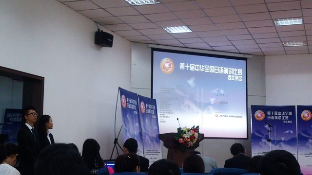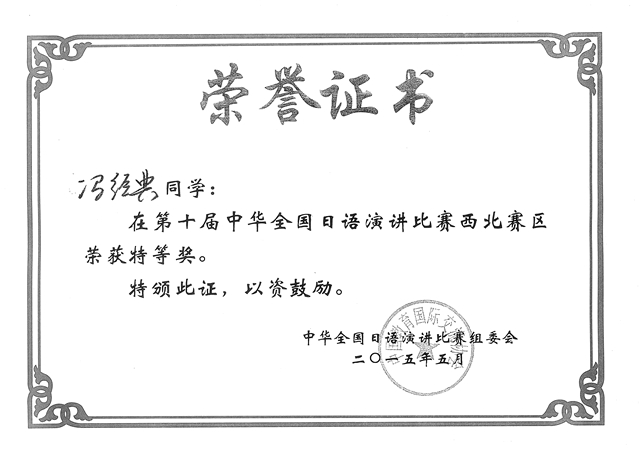 5月30日,“第十届中华全国日语演讲比赛(西北赛区)”在兰州大学医学校区明道楼隆重举行。我院选派的2012级冯经典同学在外教木村行幸老师的带领和指导下,以优异的表现荣获“特等奖”,将由主办方全额资助赴日本参加7月21日在东京举行的总决赛。指导教师木村行幸老师获得“优秀指导教师”奖。我院副院长吴少华应邀担任大赛评委会主任。 本次比赛共有来自西安交通大学、西安电子科技大学、陕西师范大学、长安大学、兰州大学、西北师范大学、宁夏大学、青海师范大学、新疆师范大学等西北五省区21所高校的21名选手参加,分为命题演讲和即兴演讲两部分。选手们就“中日交流的未来构想---机遇与挑战”或“智能手机带来的得与失”进行限时5分钟的命题演讲;即席演讲则对选手们的语言水平、知识储备、反应能力等方面进行综合考察。 在命题演讲中,我院选手冯经典以自己对智能手机的生活经历和感想为题材,阐述了“智能手机带来的得与失”这一命题的深刻理解。即兴演讲中,她又以“难忘的父母的一句话”为题,讲述了为此次比赛所付出的努力以及母亲的谆谆教诲。她自然、沉着、精彩的演讲给评委和观众留下了深刻的印象,最终以优异的成绩夺取桂冠。