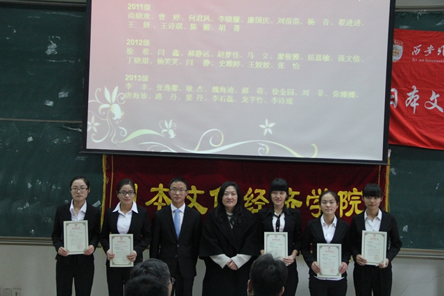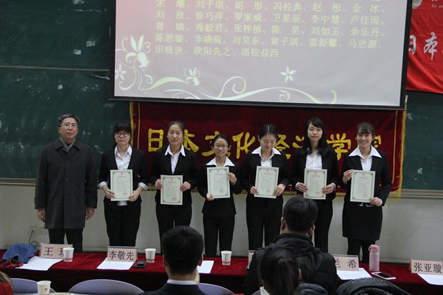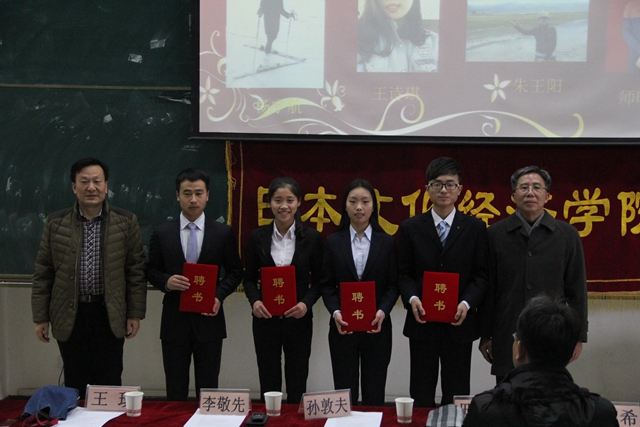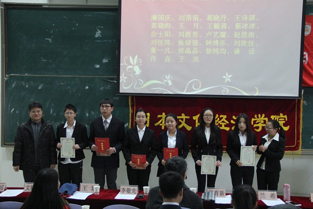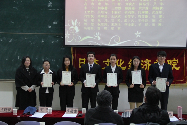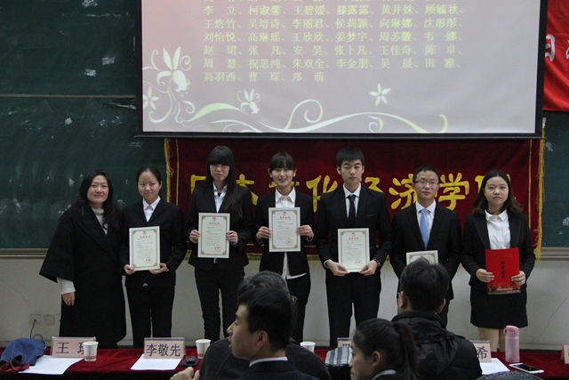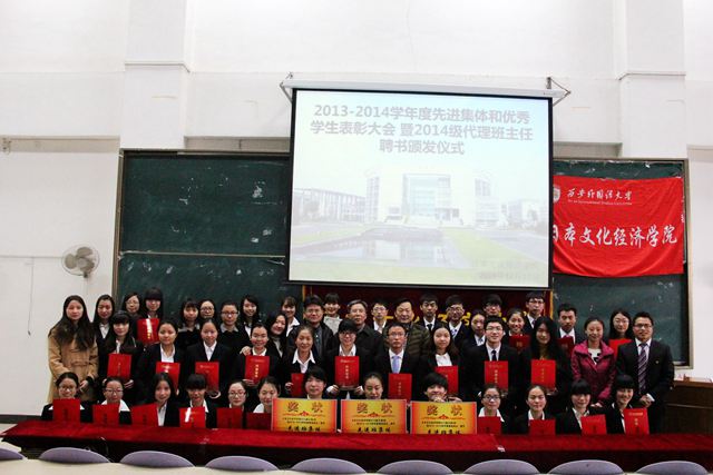 为表彰先进、树立典型、营造良好的校园学习氛围,根据我校《关于做好2013-2014学年先进集体和优秀学生表彰大会的通知》文件要求,我院于2014年12月17日中午在SA105教室成功举办了奖学金表彰大会暨2014级代理班主任聘书颁发仪式。院长孙敦夫、党委书记李敬先、副院长毋育新、经贸教研室主任王琰、全体辅导员、受表彰同学及新生代表参加了此次活动。大会由团工委书记杜刚跃主持。