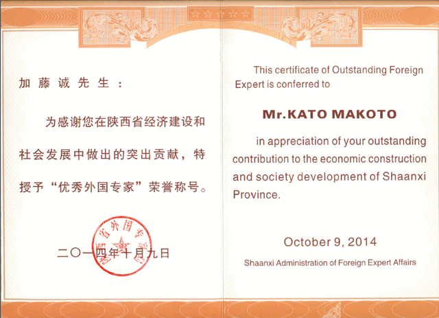 为表彰外籍专家对陕西省经济建设和社会发展做出的突出贡献,经我校推荐,“优秀外国专家”评审委员会评审,陕西省外国专家局决定授予我院日本籍加藤诚(KATO MAKOTO)先生为2014年度“优秀外国专家”称号(陕外专发[2014]28号)。2014年度,全省共有14名在陕工作的外籍专家获此奖项。这也是我校外籍专家今年又一次获得省级荣誉称号。