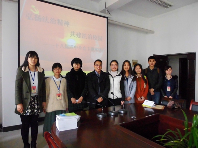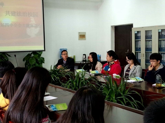 首先,与会学生观看了十八届四中全会学习视频。随后,杜老师做了学习发言,他指出本次活动的目的是学习党的第十八届四中全会关于依法治国决策的精神,了解国家法制流程,了解国家法律,从而严正自身。而国有国法,校有校规,作为一名大学生,践行依法治国方略的最好方式便是自觉遵守校纪校规,用《学生手册》规范自己的行为,为推进依法治校贡献力量。杜老师提出依法治国应该从依法治校做起,依法治校应该从依法治院做起,而依法治院应该从个人做起,从身边小事做起,只有每一个个体真正做到了懂法、用法、守法,国家才能真正达到法治。