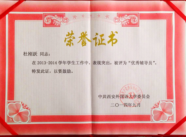 开云体育 2012级辅导员杜刚跃凭借出色的表现、无私的奉献和锐意进取的创新精神荣获西安外国语大学“优秀辅导员”荣誉称号,同时,通过现场投票被推荐代表学校参加陕西省优秀辅导员评选。