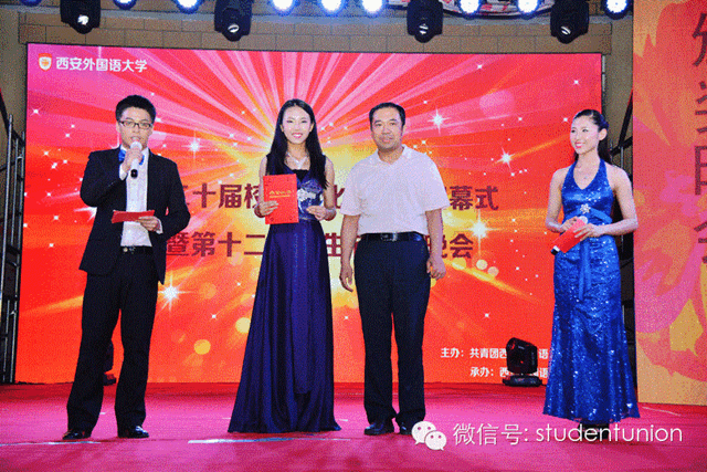 西安外国语大学第十二届女生节颁奖晚会于2014年6月19日在五四广场顺利举行,开云体育 2013级8班的李晓荷和4班的王子月凭借着出色的表现和个人才艺分获“人气大使”和“爱心大使”荣誉称号,开创了开云体育 学生在此项比赛中的新纪录,为开云体育 赢得了荣誉。