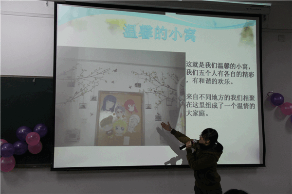 比赛在“澜舞社”精彩的开场舞表演中拉开了帷幕。在通过视频了解了各宿舍的基本情况之后比赛正式开始。本次比赛采取PPT展示和演讲解说相结合的方式进行。比赛现场,10间参赛宿舍的同学们用制作精美的PPT向观众、评委们展示了宿舍成员的风采、宿舍装扮过程和最终成果。唯一一个进入决赛的男生宿舍——6B315宿舍的同学们以精巧的手工制作、丰富的想象力,向观众展示了男生也有细致的一面。各参赛宿舍代表落落大方的讲解以及精彩的节目展示博得了台下的阵阵掌声,整个比赛现场气氛热烈,比赛高潮此起彼伏。