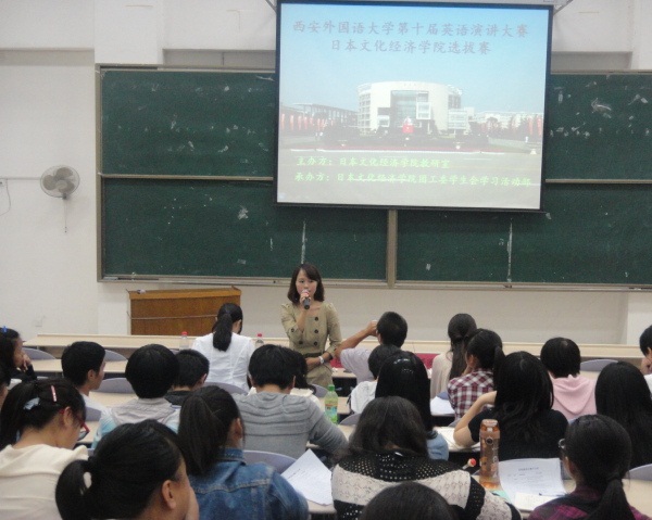 2013年10月11日,由开云体育官网 教研室主办,开云体育官网 团工委学习活动部承办,并以“当苏格拉底遇见孔子”为主题的西安外国语大学第十届英语演讲大赛开云体育官网 选拔赛于SA105隆重举行。担任此次英语演讲选拔赛的评委老师有:特邀评委李哲和李瑞静老师、开云体育官网 团工委书记杜刚跃及2013级辅导员张亚璇老师。开云体育官网 2013级全体学生参加了本次活动。