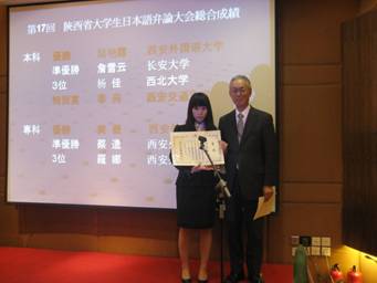 陕西省大学生日语讲演赛由陕西教育国际交流协会与日本学士会主办,是我省历史最悠久的日语讲演比赛。我校日语专业同学在该讲演赛中表现优异,曾一度创下囊括所有奖项的佳绩。本次是继2009年以来再次蝉联个人冠军和团体冠军。