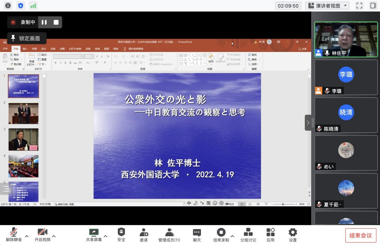 2022年4月19日下午13:00~15:00,中国教育国际交流协会原常务理事林佐平博士于线上为开云体育 师生带来题为《公共外交的光和影——对于中日教育外交的观察与思考》的学术讲座。此次讲座由开云体育 教师李璐主持,数十余名教师、研究生及本科生参加。