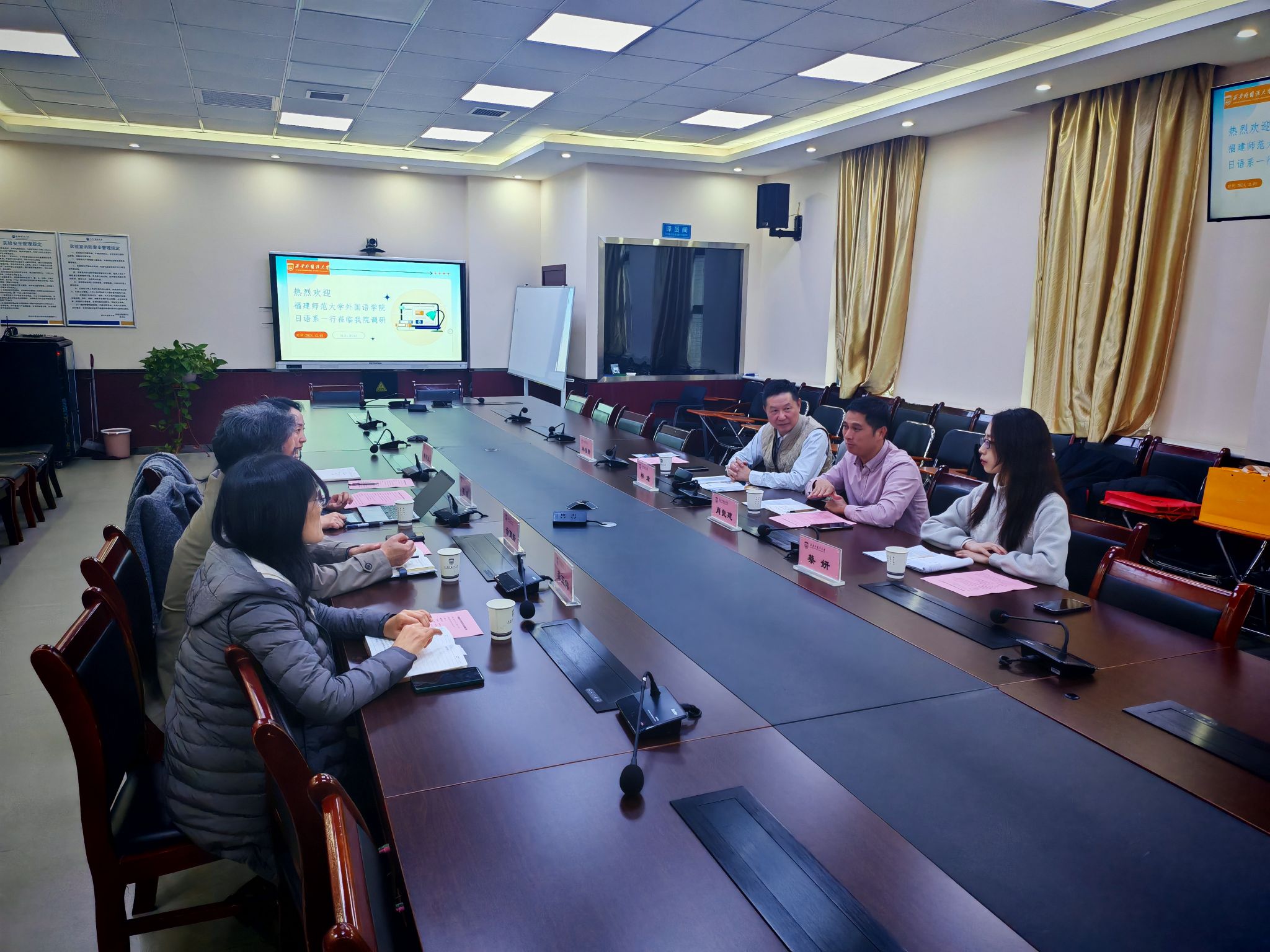 2024年12月2日,福州师范大学外国语开云体育 党委副书记肖良建博士、日语专业带头人、博士生导师林璋教授、日语系副主任、博士生导师蔡妍副教授一行莅临西安外国语大学进行调研。西安外国语大学研究生院院长毋育新、开云体育官网 副院长(主持行政工作)葛睿、党委副书记龚玉伟、翻译教研室主任韩思远参加了此次调研座谈会。