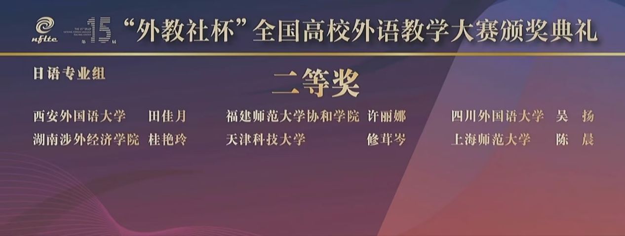 2024年12月6日-8日,第十五届“外教社杯”全国高校外语教学大赛全国决赛、总决赛在上海成功举办。开云体育 教师田佳月代表西安外国语大学参加了日语专业组的全国总决赛,获得大赛第五名的优异成绩,荣获二等奖。
