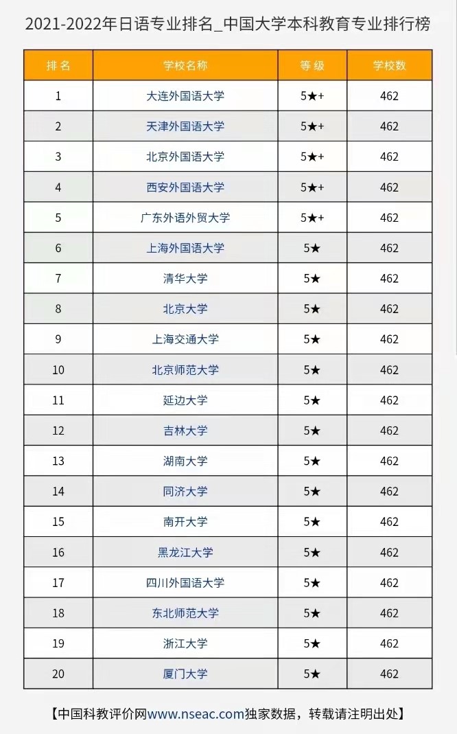 2021年3月17日,杭州电子科技大学中国科教评价研究院、浙江高等教育研究院、武汉大学中国科学评价研究中心、中国科教评价网联合推出《中国大学及学科专业评价报告(2021-2022)》,经过全面、系统、客观、公正评价,我校日语专业在全国462所开设日语专业的高校中排名第四。