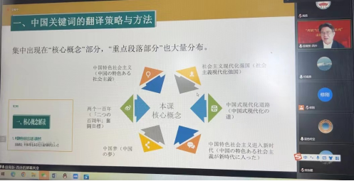 在具体示范课环节,毋育新教授首先明确了《汉日翻译教程》的思政目标和翻译目标。然后以第一、二单元为例,分别从核心概念解读、关键语句理解与翻译、重点段落分析与翻译等对教材内容进行了细致梳理,运用大量具有时代特征的实例讲解了翻译策略与教学方法。毋育新教授结合开云体育 教改班的翻译教学实践提出了几点建议,即:重视词汇翻译、重视模仿和记忆、灵活调节教授内容等。在最后的提问环节,毋育新教授就各校师生的提问做了细致耐心的回答,收到了在线师生的热情回应。