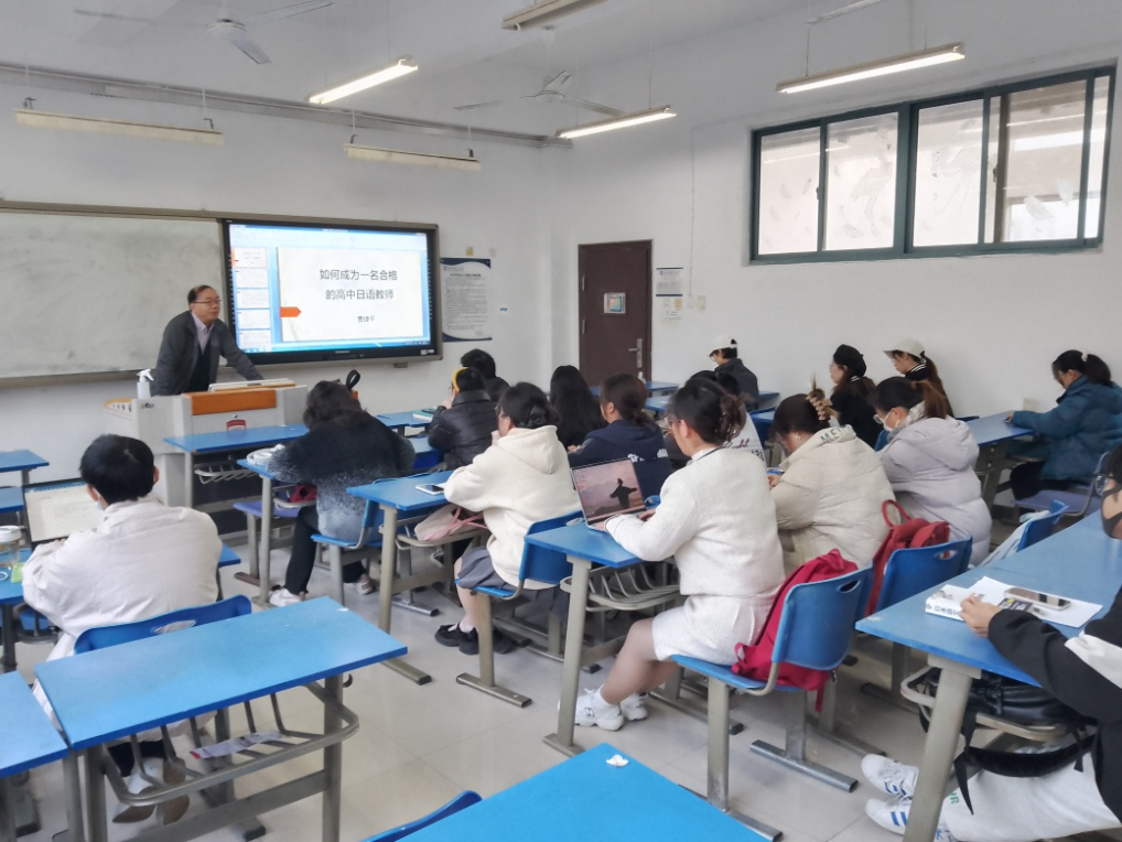 在第一个环节中,曹捷平老师以“如何成为一名合格的高中教师”为题,从高中日语教师所需资质和待遇、国家小语种高考政策、课程教学过程、高中学生管理等方面,详细讲解了高中日语教师这一职业的方方面面;王洪磊老师重点介绍了高中日语课程标准的修订情况、高中日语教材的编写使用情况、高中日语教师的职业发展规划;朱五星老师重点就大学日语教师的岗位需求及能力素质要求做了简要总结;白晓光老师重点介绍了日语教资考试试讲环节的注意事项。