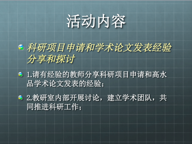 此次活动的主题为“科研项目申请与学术论文发表经验分享”,活动内容有两项:第一,请教研室三位老师分享科研项目申请、高水平学术论文发表和专著/教材出版的经验;第二,教研室成员围绕自己所关心的问题开展并参与讨论,共商构建学术团队的可能性和可行性,共同推进科研工作。