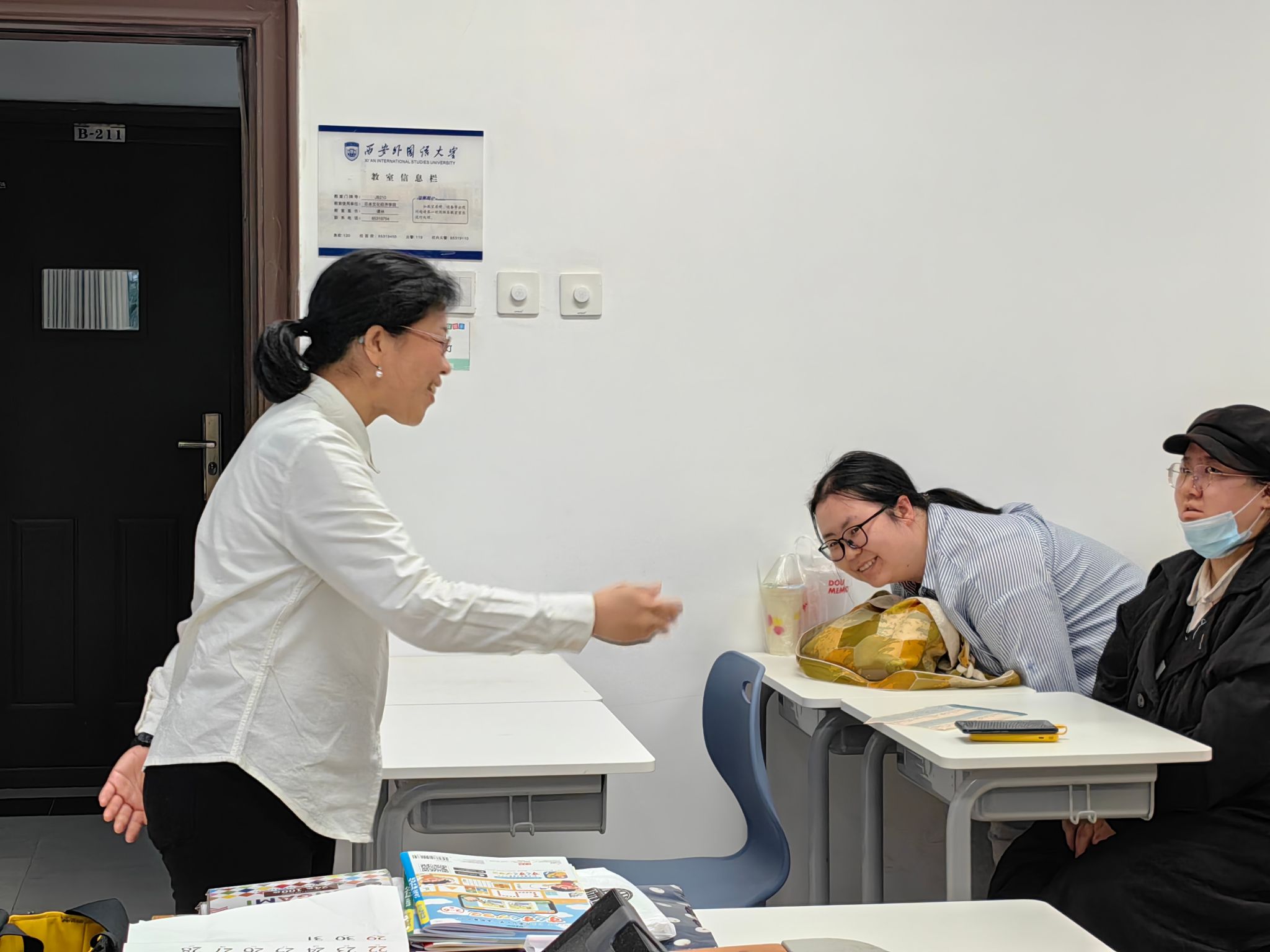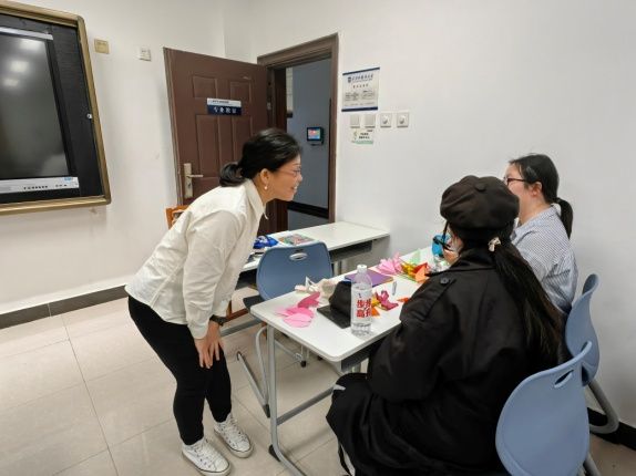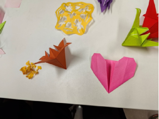 除了外教教授的方法外,同学们还展示了自己的折纸作品。有的同学巧妙地折出了花朵和爱心,色彩斑斓,充满了浪漫的气息;有的同学则别出心裁地折起了青蛙、灯笼等作品,形态各异,妙趣横生。在这个过程中,大家相互交流、相互学习,气氛十分热烈。同学们高兴地展示着自己的作品,分享着创作的心得和乐趣,欢声笑语回荡在教室的每一个角落。