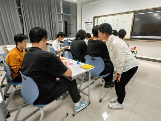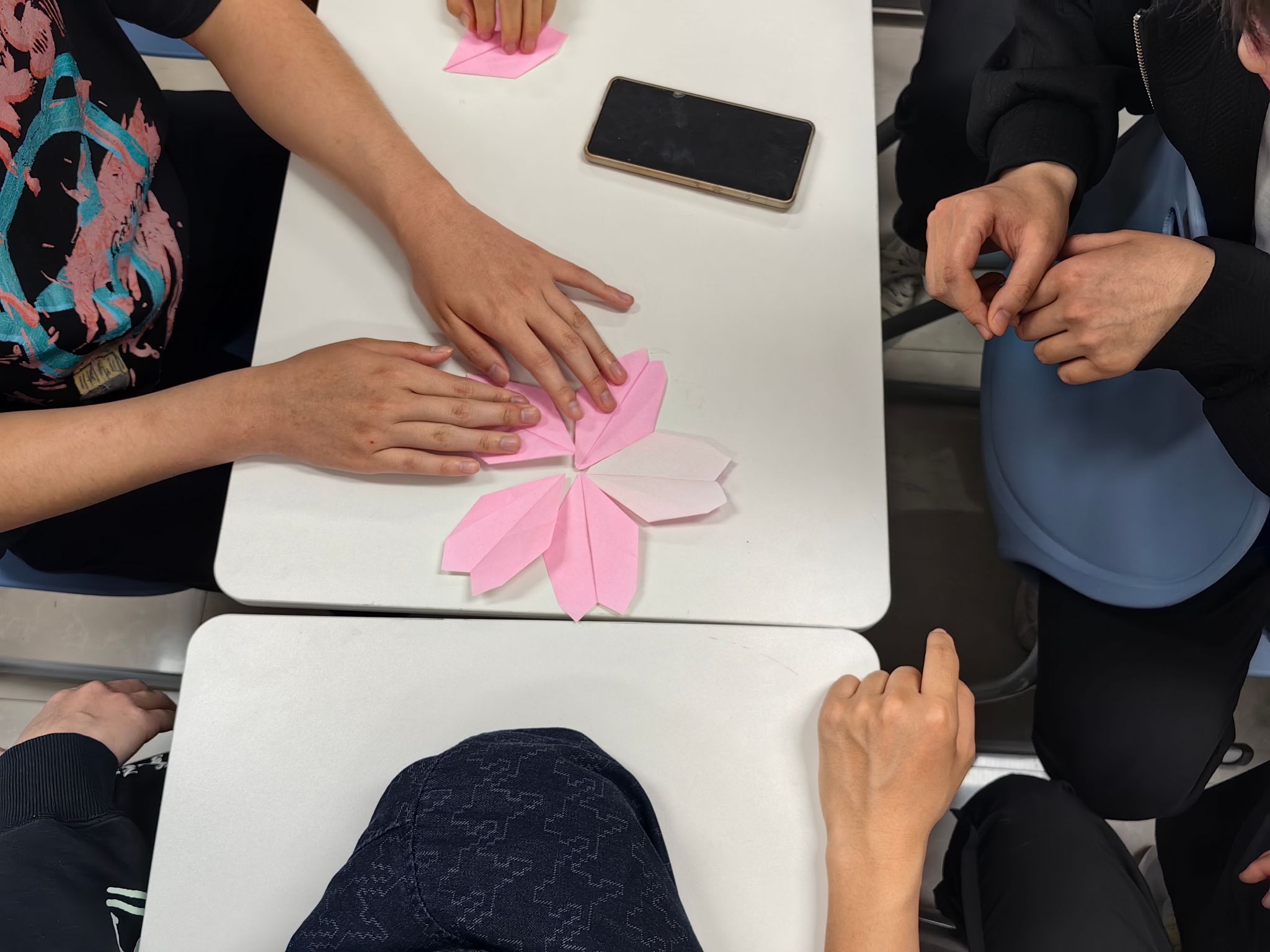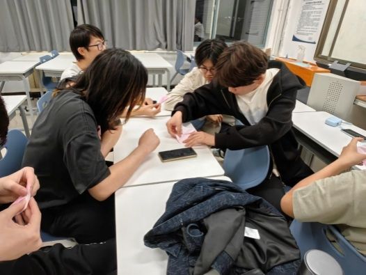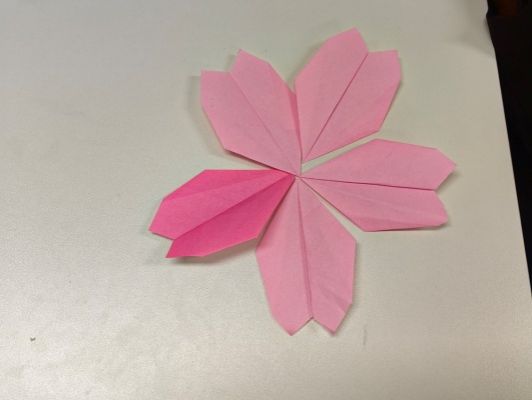 活动中,待鸟老师首先向同学们详细介绍了樱花花瓣的折法,并进行了演示,大家对着PPT上的图片,跟着老师细细探索。在老师的耐心指导下,一朵朵精致的樱花花瓣在同学们手中逐渐成型。当五个同学的花瓣拼在一起,瞬间化作一朵绚烂的樱花时,现场爆发出一阵惊喜的欢呼声。大家看着自己的作品,脸上洋溢着满满的成就感,仿佛亲手触摸到了春天的气息。