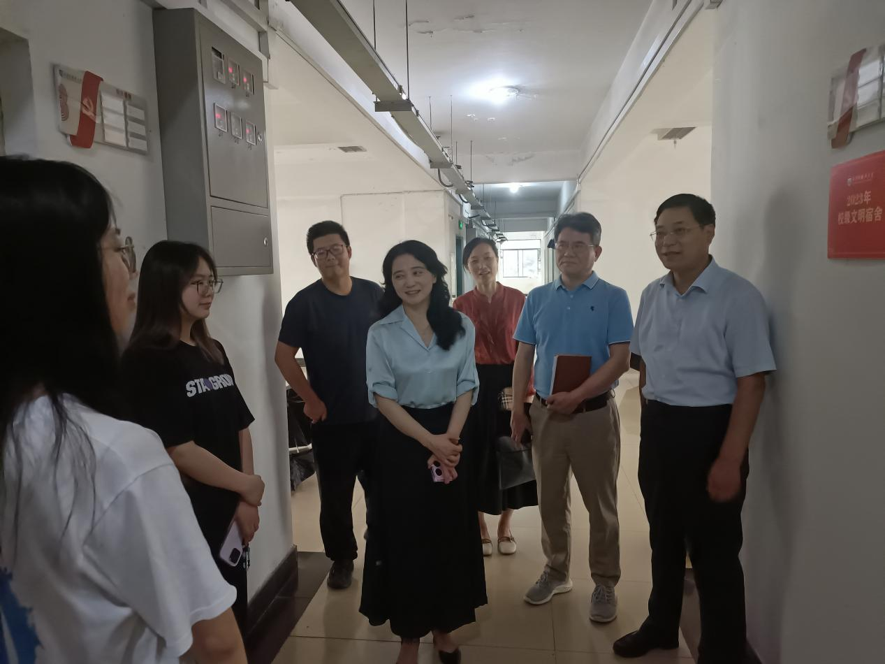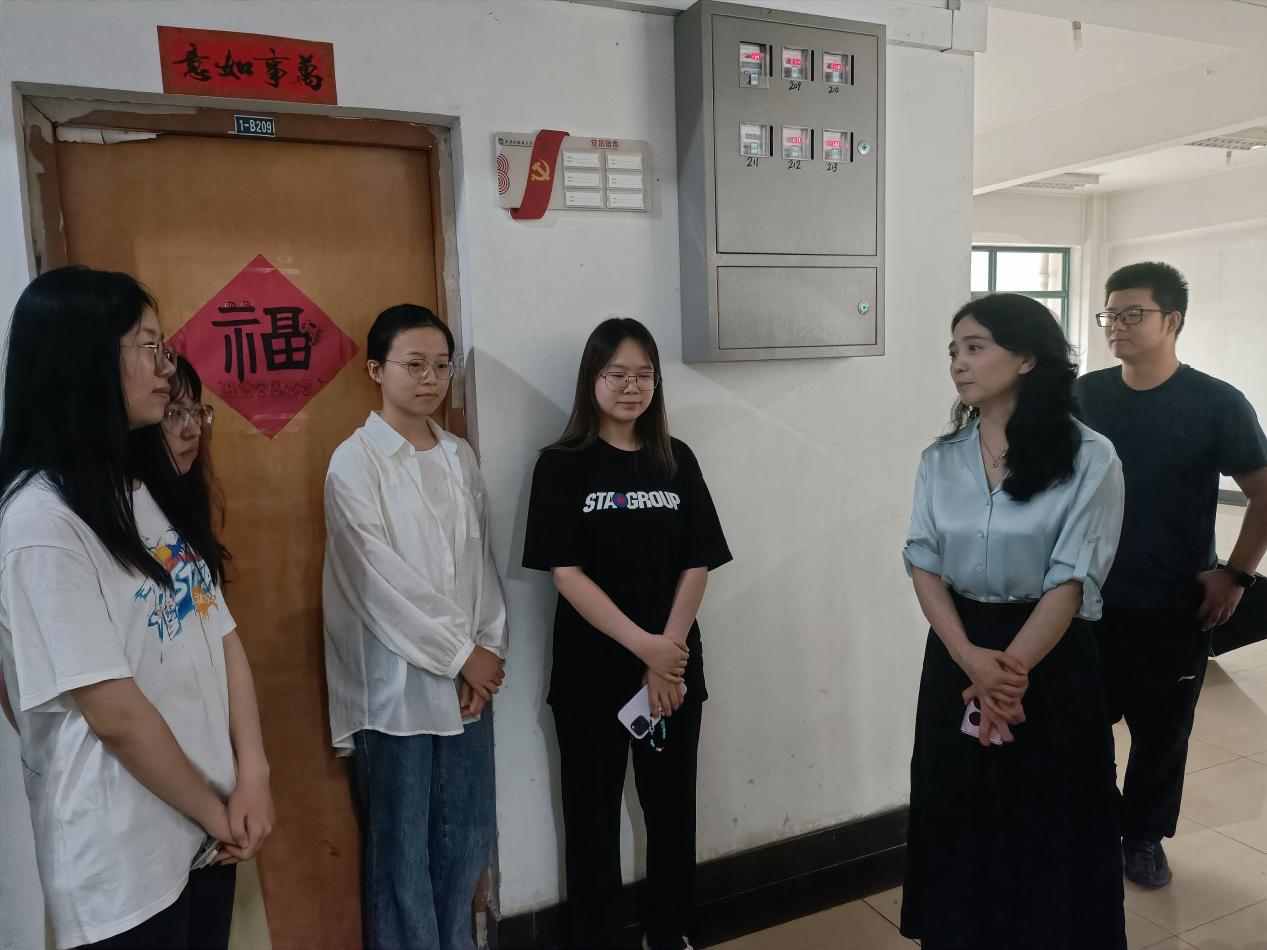 马洁在1B学生公寓与党员示范宿舍的同学们进行亲切地交谈。同学们分别汇报了各自学业情况、就业规划、出国留学等情况。马洁对同学们的学习热情和学业规划给予肯定,鼓励同学们努力学习,不负韶华,成就更好的自己。她还询问了同学们生活情况和宿舍用水用电情况,提醒同学们增强安全防范意识,高度重视用电安全、消防安全和人身财产安全,共同营造一个安全、温馨的宿舍环境。