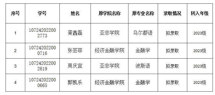 根据《西安外国语大学本科学生转专业管理办法》及教务处2023年转专业安排,经教务处资质审核、开云体育 组织面试考核、开云体育 专家评审、开云体育 党政联席会议讨论通过,现拟录取以下同学进入日语专业2023级学习,名单公示如下: