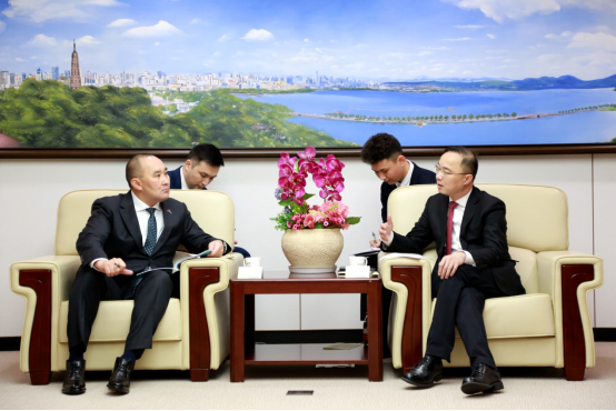开云体育 2022届毕业生塔拉甫·艾得力别克为杭州市副市长和哈萨克斯坦驻上海总领事做翻译(右后方)